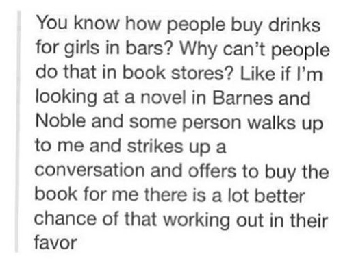 I was sitting on a bench on campus reading a boring book for class when this guy walks by and asks what I’m reading. (LESSON 1- Comment on something other than my body).